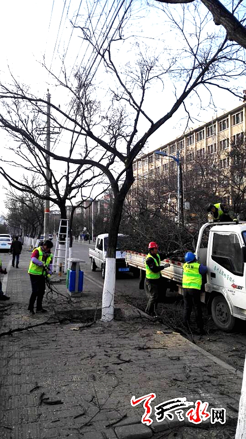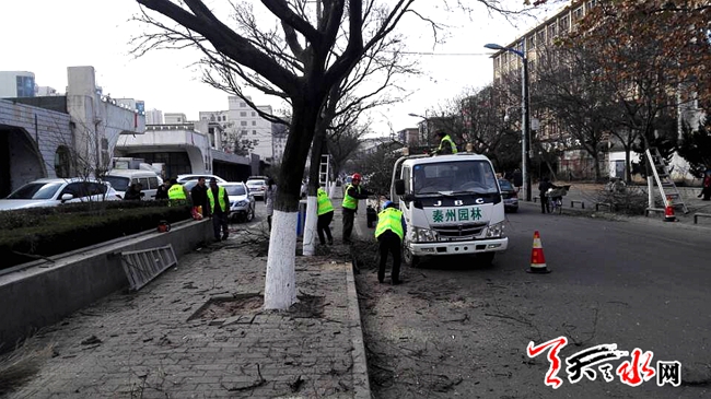 天天天水网22日17时讯 【记者 杨晓斌】秦州区永庆路,园林工人正在修剪行道树。据了解,近几天来,在树木完全进入生长休眠期后,园林工人对行道树进行全面修剪。经过今冬的修剪,明春绽绿后的行道树会更符合我市园林城市建设的要求。道路和城市会更靓丽。