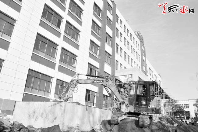 天天天水网讯【记者蔚军平】连日来,在天水市五中新建教学楼施工现场,施工方正在平整教学楼前后的路面。高五层,总建筑面积为12420平方米的市五中新建教学楼,目前内部装修工程已接近尾声,预计在明年春季开学时投入使用。