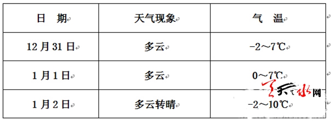 记者从天水市气象局获悉,预计12月31日至1月2日天水市天以多云为主,市区日最高气温7~10℃,日最低气温-2~0℃。天水市气象台提醒大家,元旦期间天气适宜旅游外出,但气象条件不利于空气污染物稀释、扩散和清除,市民朋友需注意防护空气污染。此外近期降水偏少,天干物燥,广大群众需注意用火安全,同时提请相关部门加强防范森林火灾。