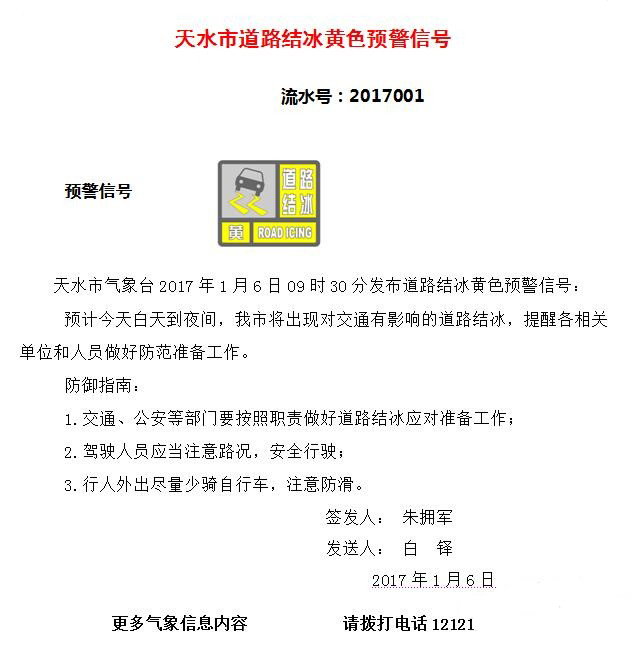 天水市气象台发布道路结冰黄色预警