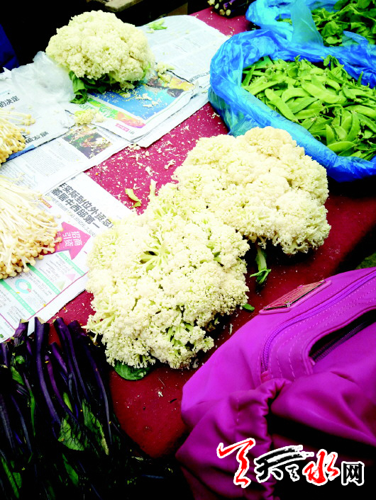 天天天水网讯【记者安蓉】1月9日上午,记者在坚家河菜市场采访时发现,在一个卖蔬菜的摊点前聚集了很多消费者,记者听到这位卖菜的摊主正在给一位顾客解释摆在摊点上的“有机菜花”。