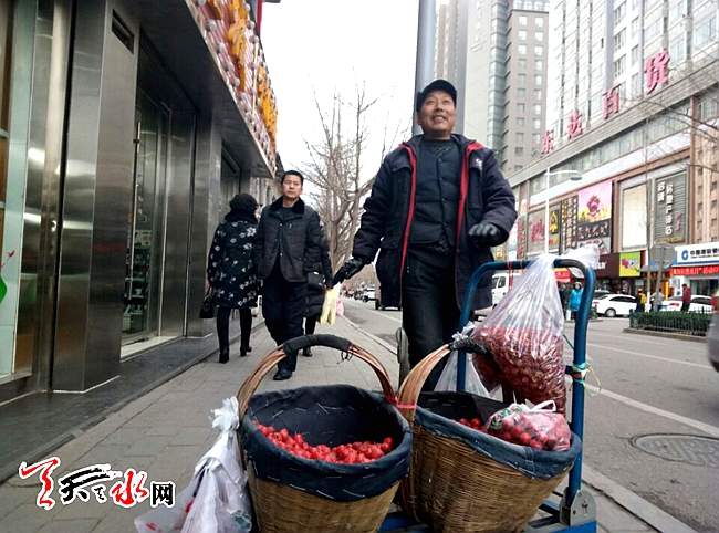 天天天水网11日11时讯【记者 王雪梅】 1月11日,在秦州区青年南路,一个买山楂的小商贩,在等待顾客的间隙,伴着附近商铺传出的音乐,扭起了秧歌。据商贩介绍,由于天气太冷,扭秧歌不会觉得太冷,也给没生意的时候找点乐子。