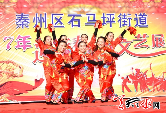 天天天水网秦州讯【记者安蓉】1月13日下午2时30分,在秦州区七里墩天河广场上,由石马坪街道莲园社区表演的舞蹈《红红的对联 火火的歌》拉开了“2017年迎新春广场文艺展演”的序幕,在场观众都被演员们的精彩演出而吸引。
