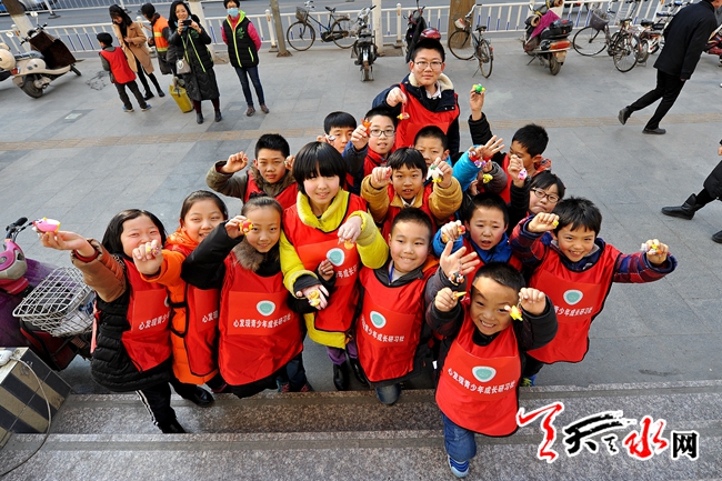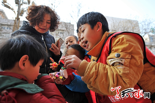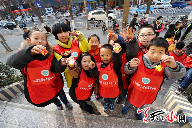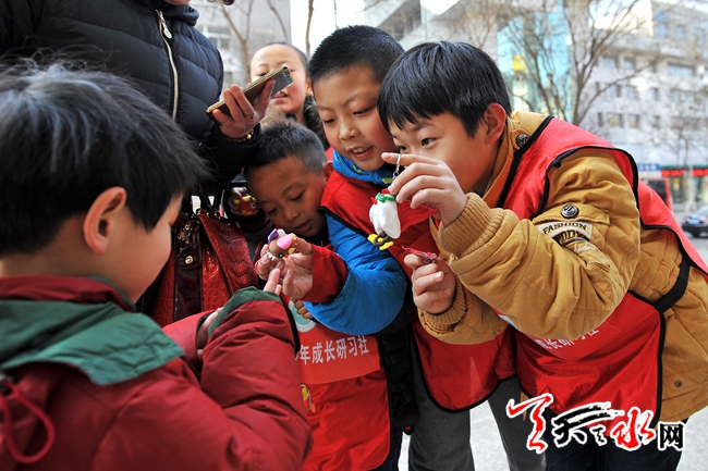 1月22日,孩子们在秦州区民主东路向记者展示自己制作的粘土卡通鸡钥匙扣。鸡年春节将至,这些学生利用寒假参加了冬令营活动,将自己亲手制作的粘土鸡造型钥匙扣在街头向市民销售,赚到的零花钱买过年礼物送给父母家人。以此锻炼表达沟通能力,培养感恩之心。记者 孙镇 摄