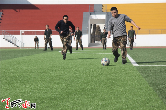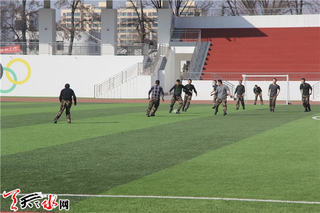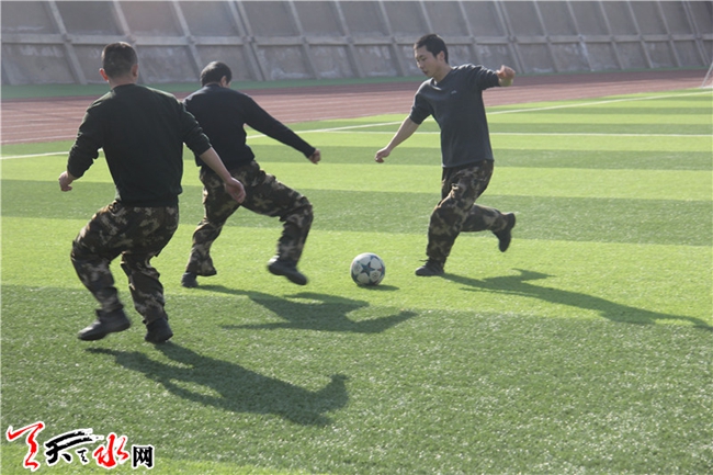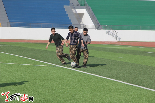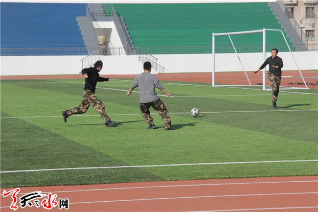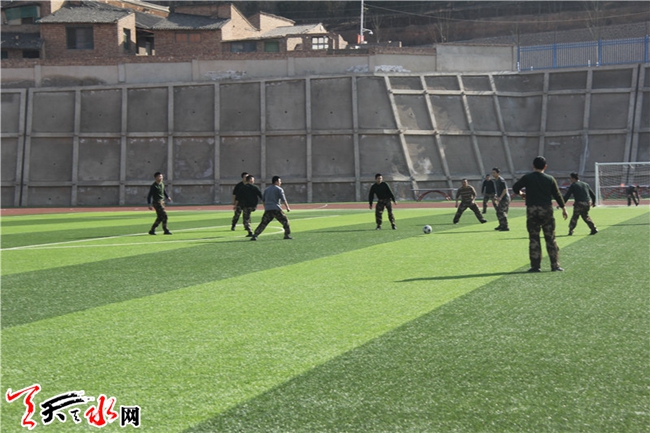 天天天水网讯(王形 朱万) 为了丰富中队官兵课余生活,缓解执勤训练压力,增进中队官兵之间的深厚友谊,进一步增强大家的向心力和凝聚力,2月15日下午,甘谷中队组织全体官兵开展足球比赛。