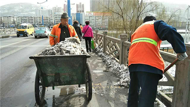由于降雪量大,降雪在形成积雪的同时,在行人的踩踏和车辆的碾压下,也形成了大面积的融雪。为及时清理积雪、融雪,确保融雪不过夜、不形成结冰,秦州区城乡环卫局出动环卫工人1200余人,动用大型高压冲洗车3辆、小型多动能冲洗车6辆、护栏清洗车1辆,利用手推车、铲雪板、铁锹、扫帚等工具对城市主次干道积雪、融雪进行了全面清理,并对污渍残留的路面进行了冲洗,有效保障了车辆行人安全和城市道路整洁有序。