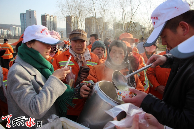 “再来一碗,热腾腾的,真好”,环卫工赵江玉在吃过一碗八宝粥后高兴地说。