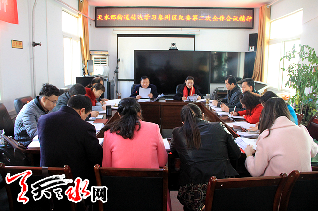 天天天水网讯(通讯员李月华)为认真传达学习区委相关会议精神,3月1日上午,天水郡街道召开专题会议,传达贯彻学习秦州区委八届二次会议暨全区经济会议、区纪委八届二次全体会议及区委政法工作会议精神,街道全体领导干部参加会议,会议由街道党工委书记成军主持。