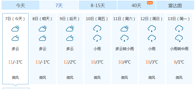 据市气象台预报,预计7日多云,8日晴间多云,9日多云,10日阴转小雨,11日阴转多云,12日阴。市区日最低气温-1℃~4℃,日最高气温12℃~15℃,日平均气温7℃~9℃。