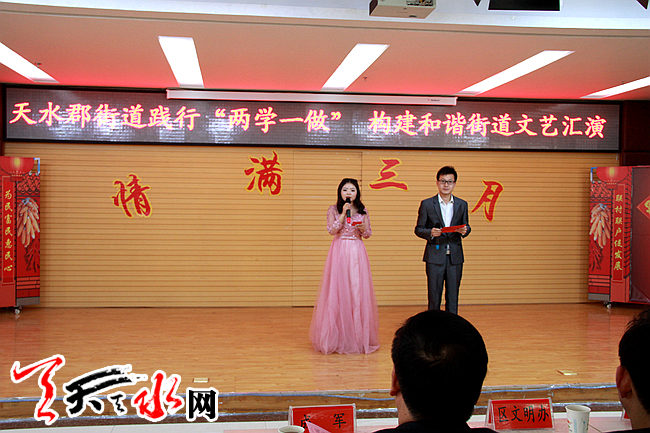 天天天水网讯(通讯员李月华)在第107个“三八”国际妇女节来临之际,为进一步践行“两学一做” 学习教育,构建和谐街道,天水郡街道在天水市第三人民医院十二楼多功能厅举办践行“两学一做”构建和谐街道为主题的“巾帼在行动、喜迎十九大”庆“三八”妇女节文艺演出活动。