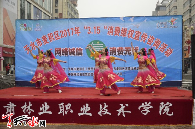 为了烘托“3•15国际消费者权益日”纪念活动氛围,甘肃林业职业技术学院的学生在活动现场进行了歌舞演出,在场的群众参与了相关法律法规、网络消费常识问答,现场气氛热烈,达到了活动目的。
