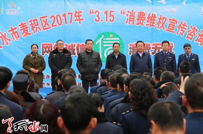 天天天水网讯 3月15日,由麦积区工商局、区消费者协会主办,中国移动天水麦积分公司协办的“3•15国际消费者权益日”宣传活动在区商埠路步行街举行。区人大常委会副主任方明太,区政府副区长樊华,区政协副主席赵延祺等出席活动;区商务局、食药监局、质监局、盐务局、烟草局、农业局、区卫计局、市区种子公司、市卫生监督所麦积分所、中国移动麦积分公司、中国电信麦积分公司等单位部分干部职工参加了活动。