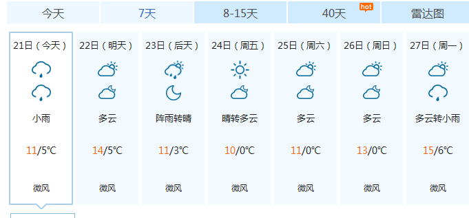 据市气象台预报,预计21~22日阴有小雨,23日阵雨,24~26日天气以多云为主。市区日最低气温1℃~6℃,日最高气温12℃~15℃,日平均气温7℃~9℃。