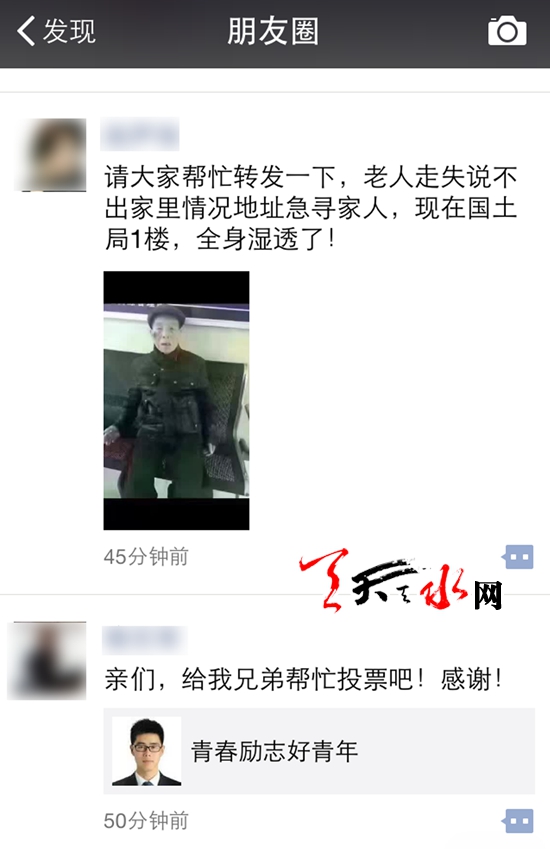 21日晚11时左右,一条“我市一位老人走失在国土局一楼,全身都湿透了,但他说不出家里的情况和家庭住址,现急寻家人,希望大家帮忙!”的消息被我市的热心网友们大量转发,大家都希望老人的家人能够尽快看到,及时将老人接回家。