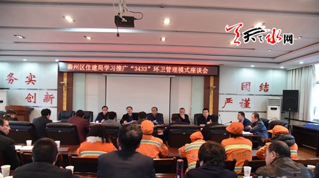 天天天水网讯 按照市委常委、秦州区委书记雷鸣同志在天水市委改革办第17期改革动态《秦州区创新建立“3433”环卫管理模式》上作出的重要批示精神,秦州区住建局迅速行动,于3月23日组织召开了学习推广秦州区“3433”环卫管理模式座谈会,住建局班子成员,局属各单位负责人、环卫局中层干部、环卫清扫工代表和局机关股室负责人等共50余人参加了会议。