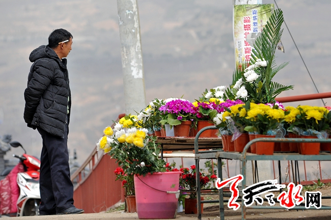3月24日,秦州区北山一处公墓路口,花商在售卖菊花。清明节将至,全社会倡导文明、绿色祭扫,人们通过献一束鲜花、植一棵树、读一篇祭文、清扫墓碑等方式寄托哀思、悼念先人。记者 孙镇 摄