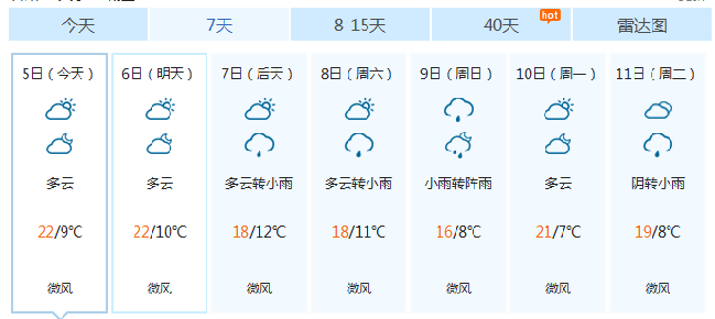 据市气象台预报,预计5~6日多云,7日阴转阵雨,8~9日阴有小雨,10日阴转多云。市区日最低气温8℃~12℃,日最高气温15℃~22℃,日平均气温12℃~16℃。