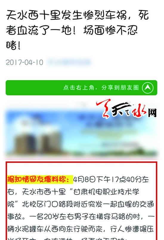 此时,记者又发现朋友圈中有许多微友在转发一则题为《天水西十里发生惨烈车祸,死者血流了一地!场面惨不忍睹!》的微信链接,记者追溯源头,原来是我市的一家自媒体平台发出来的。对于这起事故的描述,这则微信链接是这么说的:“据知情网友爆料称:4月8日下午17点40分左右,天水市西十里‘甘肃机电职业技术学院’北校区门口路段附近突发一起血腥的交通事故。一名20岁左右的男子在横穿马路时,有一辆水泥罐车从西向东行驶而来,行人惨遭碾压当场死亡,血流满地,场面惨不忍睹……”