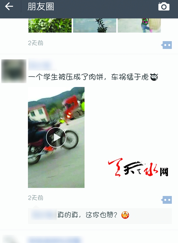 4月8日20时许,记者的微友“豆豆”发布了一条关于车祸现场的朋友圈,并配上了“一个学生被压死了,车祸猛于虎”的话语。于是,记者联系上了微友“豆豆”。“豆豆”称,他下班途经位于秦州区西十里的甘肃机电职业技术学院北校区附近时,看见有交警正在处理一起车祸,现场挺惨烈的。当时围观的人很多,他便拍摄了视频,并发出了这样的感慨。