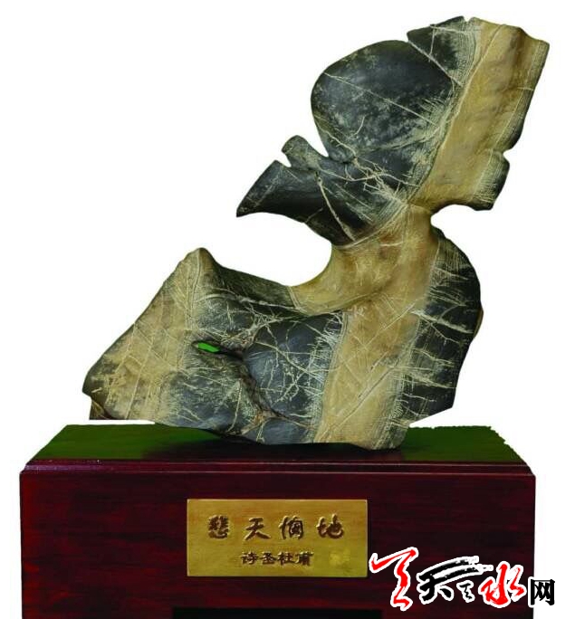 石一出箧,仙君立即两眼生光,神气非常,引我们细品其韵。仙君问“此似谁?”便自答“诗圣杜甫也!南郭寺杜甫雕像不与此相像吗?”杜甫安史之乱时流寓天水近百天,写下117首《秦州杂诗》,最为人知者,乃“山头南郭寺”一首,南郭寺有杜甫祠,所塑诗圣像,真与此石神态相若。石小,可因需正侧翻转,720度观看。石侧,一凝神苦思之古希腊人跃然而出,仙君说“这是柏拉图”。经他一指点,果然越看越像,甚至能品出饮毒酒之后的痛苦与哲思。松涛局长说“此石中人、物、景,皆对称而现,有中国的诗圣,就有西方的大哲。其他更奇更妙者,殊多!”他双手怀抱奇石,如入宝山圣境般,引大家一一看来。果然,有桂林山水、有大漠戈壁,有俯冲之鹰,有欲脱之兔,有匍匐巨龟、有待食大鳄,有生命之源、有拔岳之势,有玲珑玉足,有大头皮鞋,有单峰骆驼,有马踏飞燕,有阴阳卦爻,有观音开示……主人兴趣盎然,观者望石兴叹。突然,仙君说,石中还藏三字,乃“天水人!”石天造地设,随势象形已不易,还可产于安徽而自署天水人?石之正面,上端一横,其下痕如悬丝,乃草书之“天”字,再下,凸起成脊,两侧各有折痕,如行书之“水”,其中一折,专门细看,居然是标准如人民币上“中国人民银行”中的“人”字,非常规范的正楷。我大笑,说三个字,包括了正楷、草书、行书,仙局长为此石,是真操心啊!