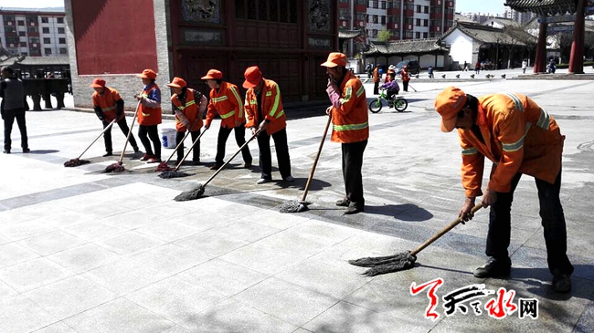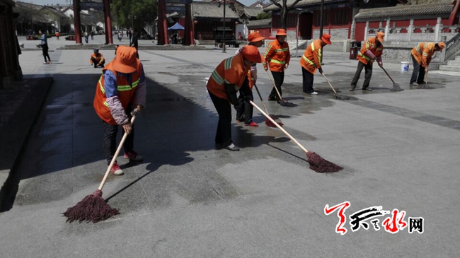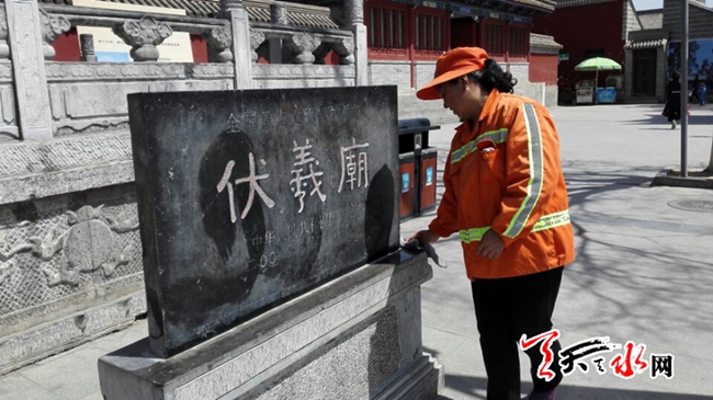 天天天水网18日17时讯 【记者 邵兰霞】4月17日,为了加强对伏羲庙环境卫生管理,确保环境的整洁有序,秦州区环境管理局西关环卫管理所在加强日常环境卫生清扫的同时,定期检查,定期对卫生死角、建筑物上刻字涂鸦进行集中清洗,为广大市民和游客提供一个整洁美丽的旅游环境。