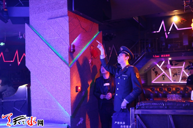 天天天水网讯 为深入推进春季火灾防控工作。近日,甘谷大队联合县城关派出所对辖区内公共娱乐场所开展突击夜查行动。联合检查组先后来到甘谷县聚点音乐餐吧、甘谷县苹果网咖等公共娱乐场所进行消防安全检查。通过检查发现,检查人员及时督促各场所负责人对可当场整改的火灾隐患当场整改,不能当场整改的,下发了限期整改通知书。