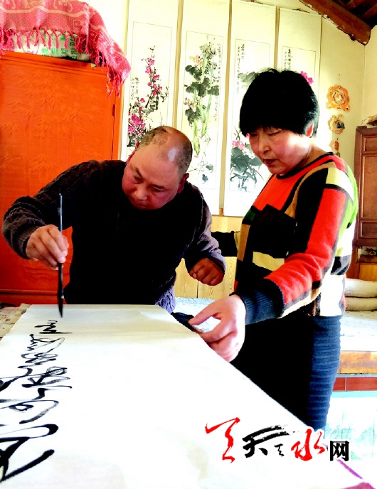 一进院门,院子不大,但非常地干净、整洁。一位中年男子手握毛笔站在桌旁正在练习书法,看到有人进来,立刻笑脸相迎,“我腿脚不好不能去接你们,赶快进屋来,坐下歇歇。”