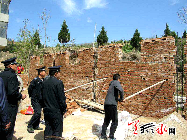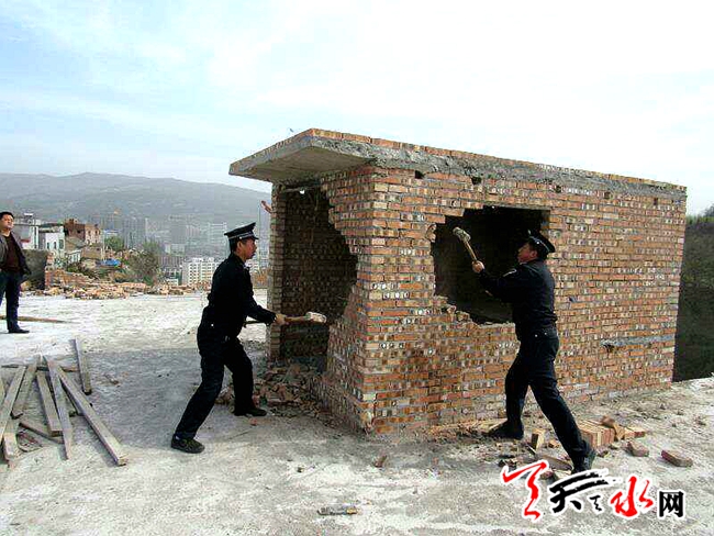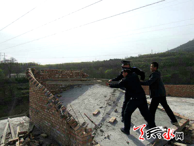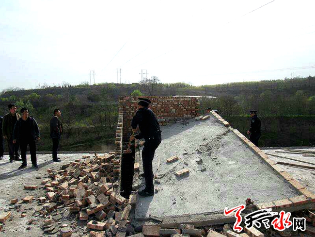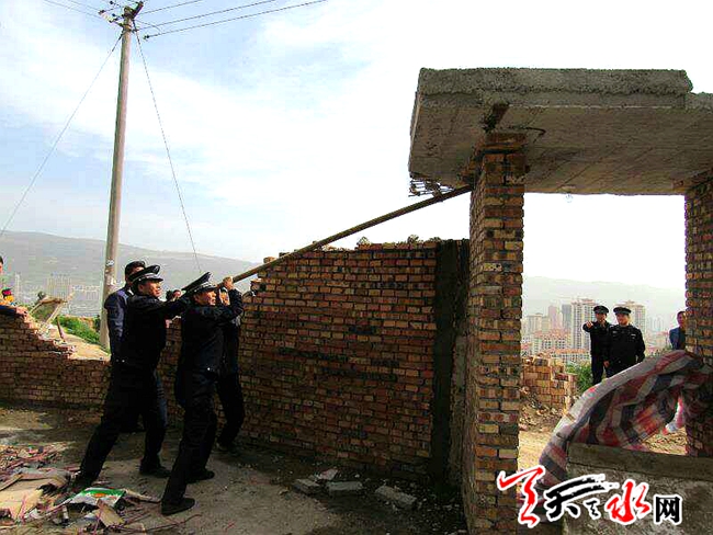 天天天水网讯【记者杨旭 通讯员周维元】4月21日上午,由秦州区玉泉镇、区执法局和区国土资源局组成的联合执法小组对石马坪村和上河村占用公共空地违法建房进行清理拆除。