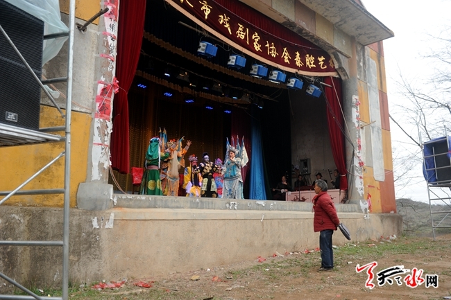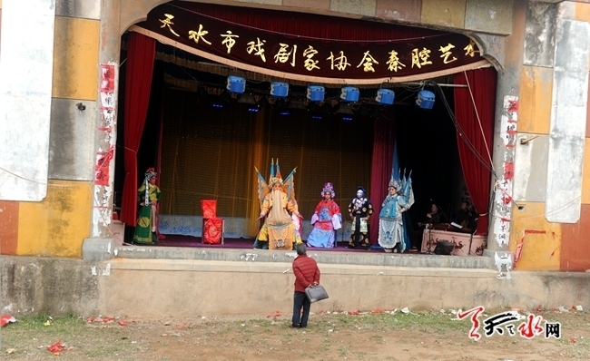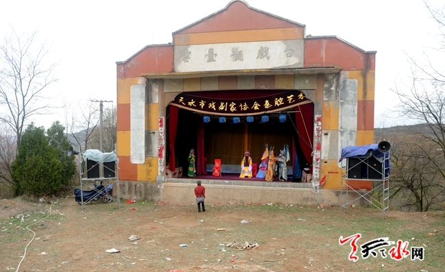 天天天水网25日17时讯【记者 杨晓斌】4月25日,地处秦州区皂郊镇热寺湾自然村的云台观(当地人称小坡寺)迎来一年一度的庙会。当天因为天气突变,观众数量锐减,偌大的戏场上,只有数名观众。其中戏场中央只有一人在忘我地看戏,其他几名观众躲在避风的地方看戏。即使仅有几名观众,演员们还是卖力地演唱着。