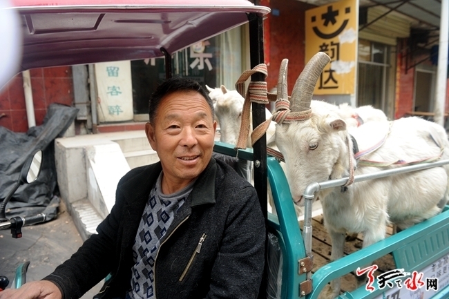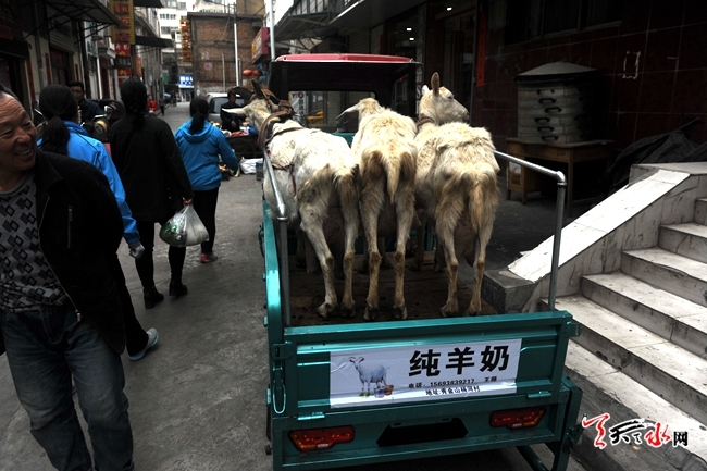 4月26日,秦州区新华路,一位奶农用电动三轮车载着奶羊走街串巷,到处吆喝着卖羊奶。