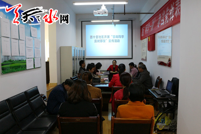 天天天水网讯(通讯员李小霞)为进一步加强反邪教警示教育活动,增强广大居民群众自觉抵御邪教侵蚀的能力,真正使教育入耳入脑入心。2017年5月4日,天水郡街道西十里社区组织社区干部、居民小组长在社区会议室开展“崇尚科学 反对邪教”为主题的宣传活动。
