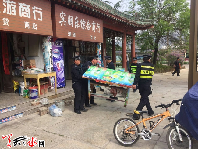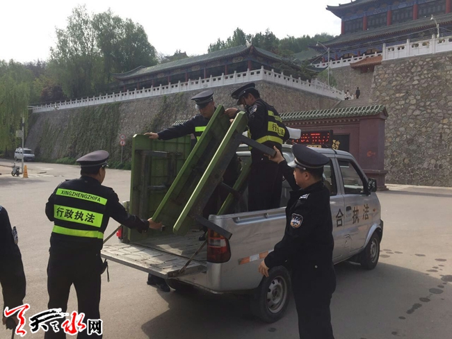 近日,该中队组织执法人员将南郭寺山门口两侧长期占道桌椅进行了依法暂扣,共计13张桌椅2张木柜。通过整治,景区周边店外经营占道及占道桌椅的违章现象得到了有效改善,景区周边环境恢复了干净整洁。
