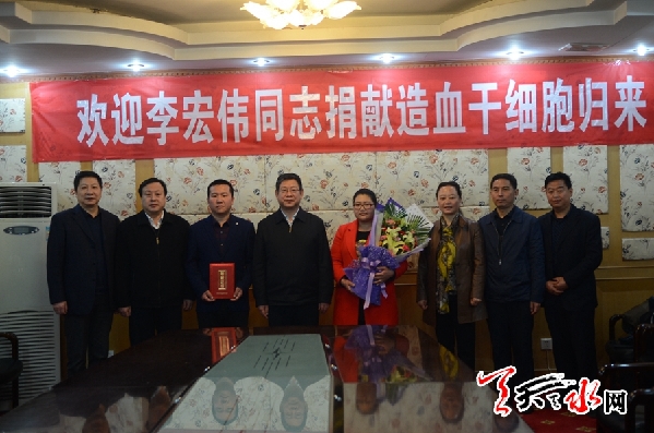 天天天水网讯【记者杨璟】清水县白驼镇干部李宏伟日前在西安唐都医院成功捐献190毫升造血干细胞,挽救广西一名16岁男性白血病患者生命,成为我市第1例、全省第27例造血干细胞捐献者。3月22日上午,市政府举行座谈会欢迎李宏伟归来。副市长张建杰出席座谈会。( 详细报道《《《 )