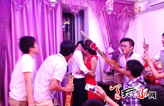记者中途因为觉得闹得有些过分而提出制止,却被其他朋友嗔怪,“大喜的日子就图个热闹、高兴,你就别扫兴了。”记者一时语塞,只能退出房间。