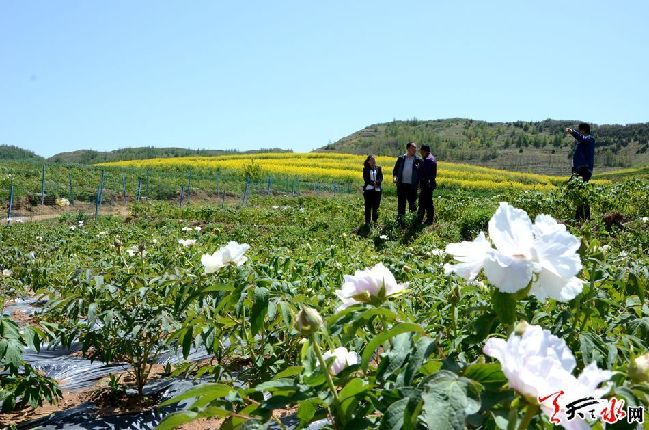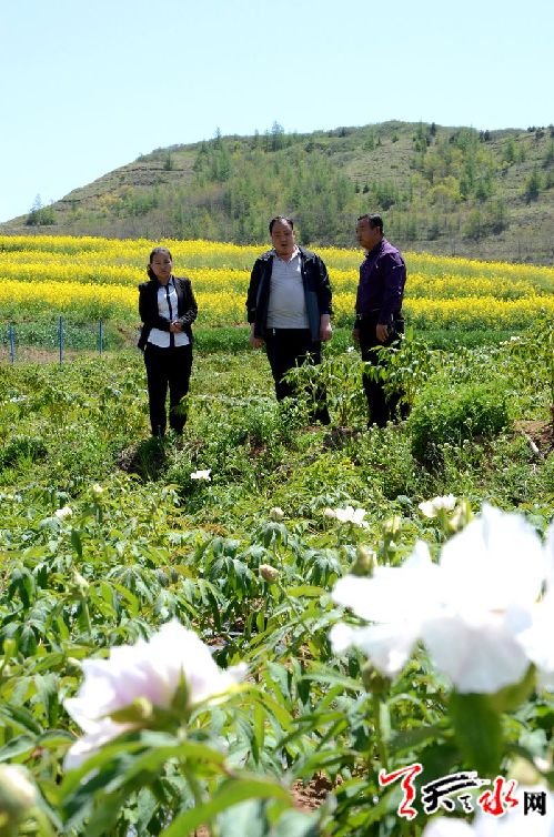 不久,通过对当地土壤的检测和市场前景的考察后,杨海东克服重重阻力,先后注册成立了益农种植合作社、天水广发开发有限公司,陆续流转土地600多亩,种植起了油用牡丹。周边村庄的几十名群众也到他的基地打工。“我们每栽一天能挣到50块钱,不用外出打工,也方便照顾家里,比自己栽种这个更实在。”正在给牡丹松土的村民说。