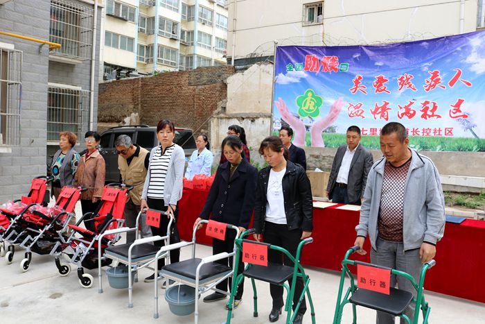 社区举办了以“关爱残疾人、 温情满社区”为主题的助残扶残活动。活动现场为残疾人发放了轮椅、助行器、坐便椅、盲杖、语音寻物器、爱心布鞋等物品25件。七里墩街道卫生服务中心的大夫为残疾人朋友讲授了康复知识。