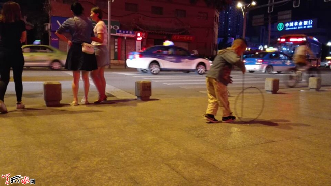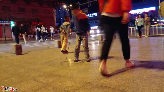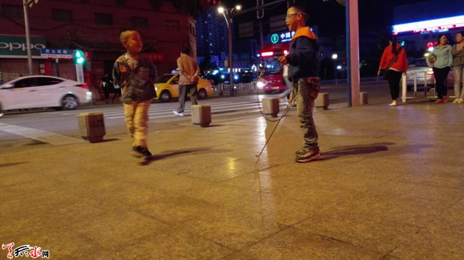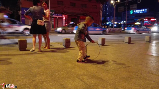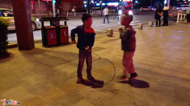 天天天水网25日22时讯(记者苏中豹) 25日晚,秦州区民主路广场边人行道上两名小男孩在家长陪伴下在学习滚铁环。铁环是一种上世纪中后期人们普遍喜玩的儿童玩具,滚铁环可算是一项颇为古老的技艺,近年已几至失传。如今再次见到有孩子笨拙而又兴高彩烈地学滚铁环,路过的几位中年人纷纷点赞,认为孩子学习些传统游戏技艺,强过沉迷电脑手机。