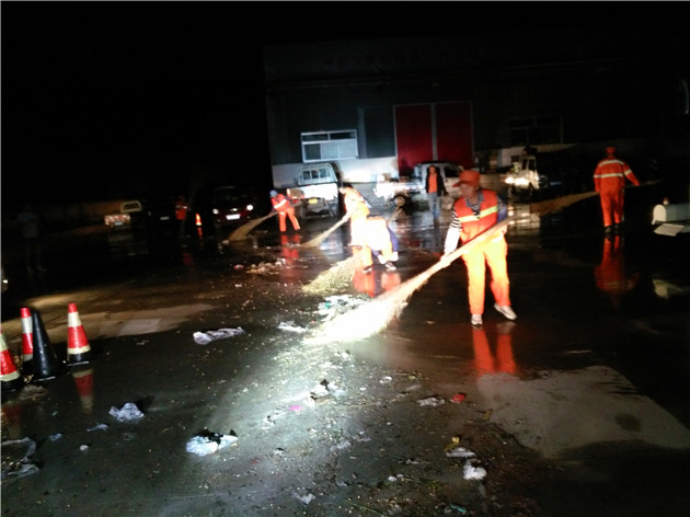 同时,对沿线实施了常态化、机械化除尘降尘保湿作业。动用大型洒水车1台,高压冲洗车1台,小型多功能冲洗车4台,每天实施不间断洒水除尘作业,并对路面污渍进行了大范围的冲洗工作;动用道路吸尘车1台,对沿线实施全天候吸尘作业,最大限度降低路面灰尘对周边环境造成的污染。