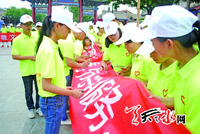 6月14日,由共青团天水市委主办的“发扬志愿精神,参与节会服务,扮靓美丽天水”暨青年志愿者签名承诺服务活动在伏羲广场举行,来自全市360名青年志愿者纷纷签名承诺,将充分发扬志愿精神,积极行动起来,以饱满热情的姿态投入“节会”活动。