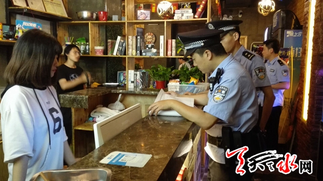 6月17日晚至19日晚,为全力做好伏羲文化节的安保工作,充分发挥公安机关打、防、管、控职能,进一步净化社会治安环境,提升群众安全感,秦州公安分局开展集中清查活动。采取公秘结合,定点出击的方式,清查重点复杂场所丶收缴危险违禁物品,及时消除事故隐患,确保节会安全有序举行。记者 邵兰霞摄