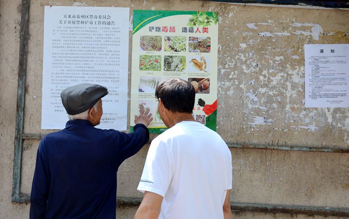 月20日上午,秦州区七里墩街道海林社区在辖区内人员密集的家属院开展了禁种铲毒宣传教育活动。活动当中工作人员通过悬挂宣传禁毒警示横幅、发放宣传资料、采用宣传栏、LED电子显示屏、QQ、微信等方式,向广大居民群众宣传国家法律法规,禁种铲毒的重要性以及毒品给人类和社会带来的严重危害,动员广大群众要积极检举、揭发非法种植罂粟的违法行为,确保“零种植”。