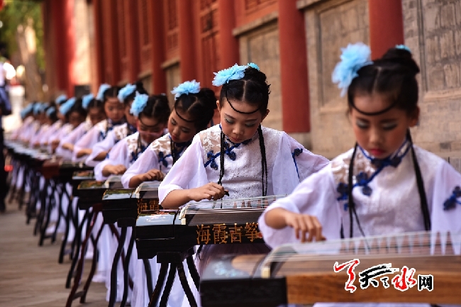 6月18日傍晚19时,一场突如其来的雷阵雨让路上的人们更加行色匆忙。而海霞古筝学校的教室里,48名即将参加公祭中华人文始祖伏羲大典演奏的学生们,在教师王晓誉的指导下集中弹奏着《高山流水》,柔和舒缓的古筝乐曲好似一阵清风,把聆听者带入了山谷中若隐若现的云雾身旁。