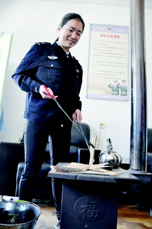 在办公室,我见到了蒲文涛,大概30岁刚出头,整个人看起来非常干练,他和民警赵军对我的到来表示了欢迎。“这个季节,我们的办公室还是特别冷,不生火根本待不住。”说这话的是赵军,一个20来岁的小伙子。此时,他正站在火炉旁,一边生火,一边和我说话。我接过赵军手中的火钳,尝试着把火生起来,可是试了好几次,都没有成功。最终,还是赵军把炉子给生着了。别说这有火没火还真是不一样,不一会儿,办公室里就暖和起来了。
