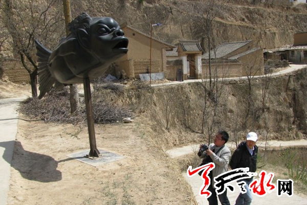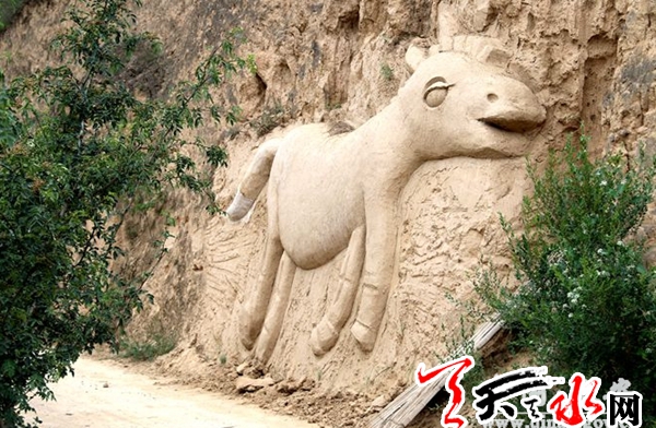 再往前走,就是村民靳彩琴与艺术家高峰合作完成的作品《是你的也是我的》,那是一匹马,面朝着村庄的方向站立在土崖中。