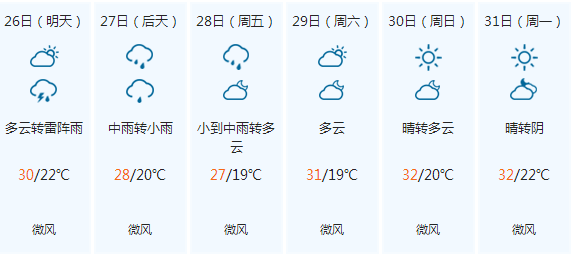 据市气象台预报,预计26日,我市天气以多云为主,27-29日,我市将有一次降水天气过程。市区日最低气温19℃~23℃,日最高气温27℃~34℃,日平均气温23℃~25℃。