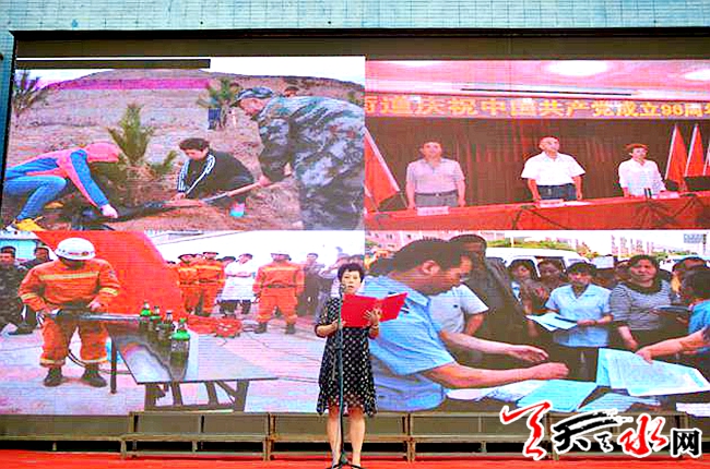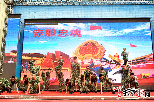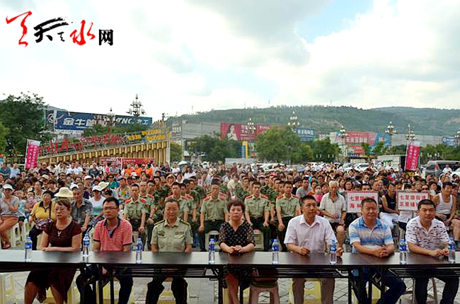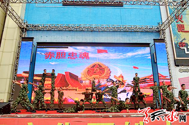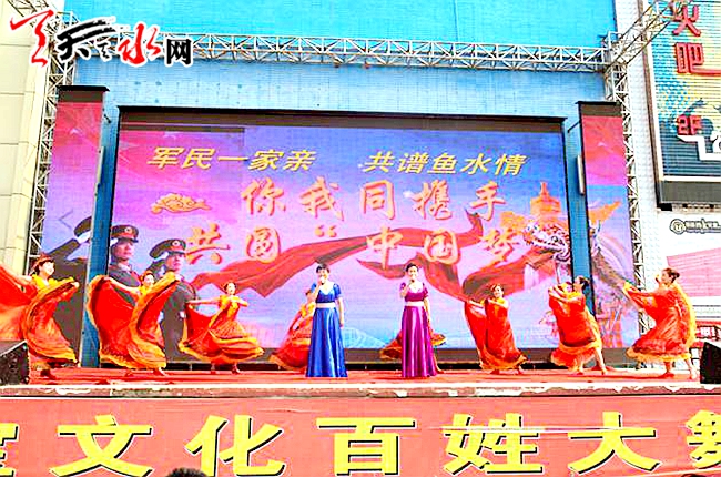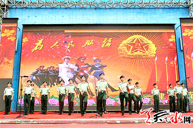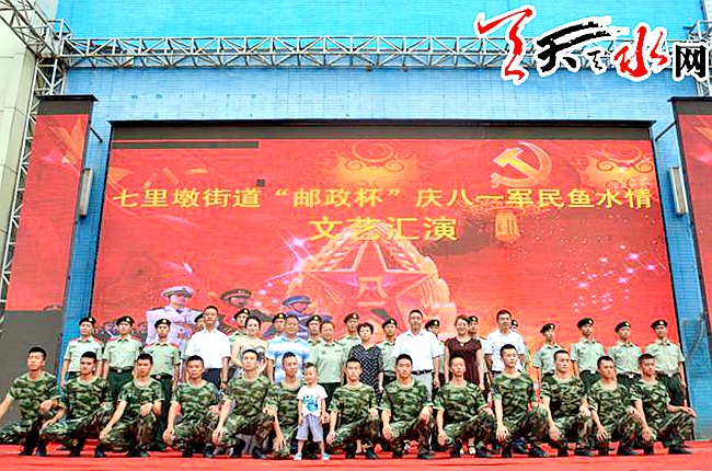 天天天水网讯 7月26日,在建军90周年来临之际,七里墩街道在天河广场百姓大舞台举办“军民鱼水情”文艺汇演。街道全体干部职工、天水市消防支队官兵和居民群众800多人观看了演出。