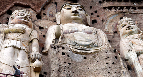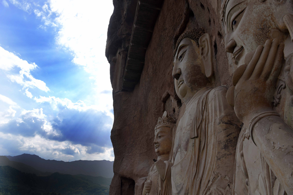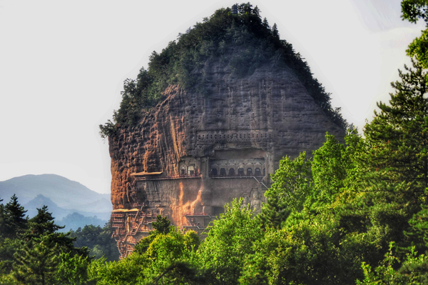 在秦岭山脉西段的小陇山林海深处,一座孤峰突起、犹如农家麦垛的奇峰巍然屹立,这就是麦积山。麦积山石窟始建于1600多年前的十六国后秦,洞窟“密如蜂房”,栈道“凌空飞架”,其惊险陡峻为世罕见,形成了一个宏伟壮观的立体建筑群,现存的194个窟龛、7000多件泥塑与石刻成就了“东方雕塑艺术馆”的千秋盛名。峭壁之间镌石成佛,凌空栈道迂回盘旋,行走在麦积山悬崖之上,脚下是蓝天白云,眼前是石窟壁画,万龛千窟接通了佛国与尘世,仿佛穿越了历史。
