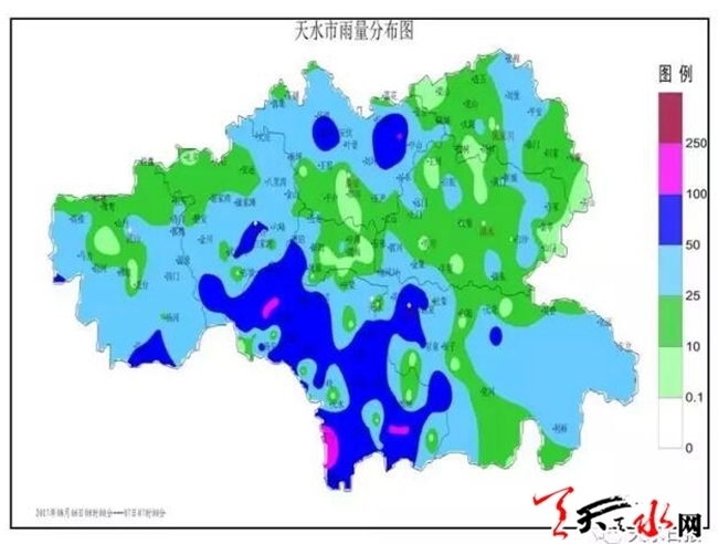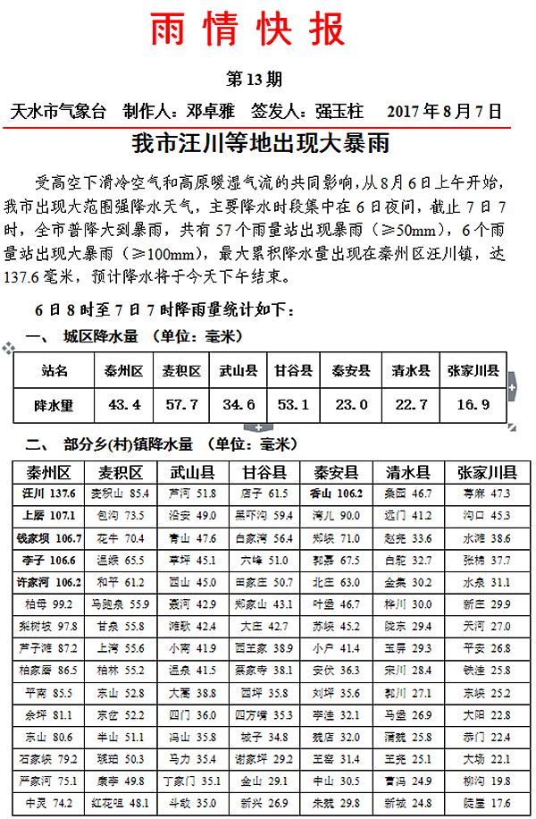 据秦州区气象局消息:截至8月7日8时,秦州城区降雨量为50.6毫米。雨量大于50毫米的镇有14个(单位:毫米):汪川146.5,大门76.1,娘娘坝77.9,平南94.4,牡丹69.6 ,藉口80.7,关子64.5,秦岭79.0,太京74.1,皂郊79.6,华歧78.3,齐寿71.8,杨家寺64.6,玉泉59.0。雨量小于50毫米的镇有2个:小天水44.8,中梁26.7。雨量超过100毫米的村级雨量点有6个(单位:毫米):汪川镇的柏母104.8,藉口镇许家河115.4,上磨112.7,娘娘坝镇的李子110.1,钱家坝109.8,秦岭镇的梨树坡109.0。