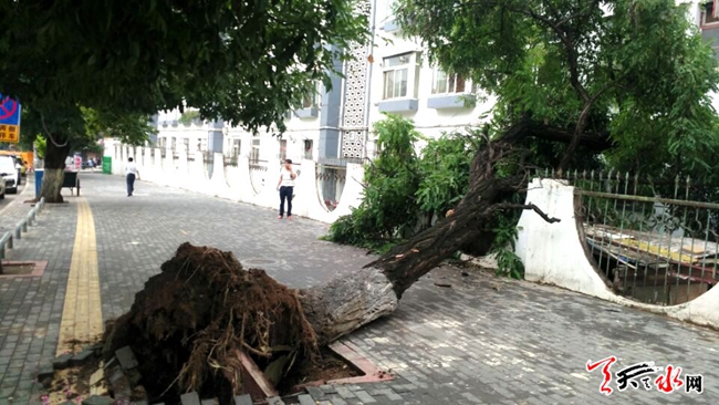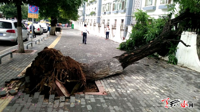 昨夜凌晨 秦州区泰山东路一株老槐因雨连根拔起