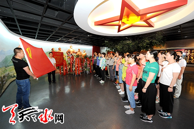 在红军长征哈达铺纪念馆大型伟人浮雕前,麦积区林业局机关党支部全体党员面对鲜红的党旗,紧握右拳,重温入党誓词,饱含激情,以铿锵有力的声音许下铮铮誓言。